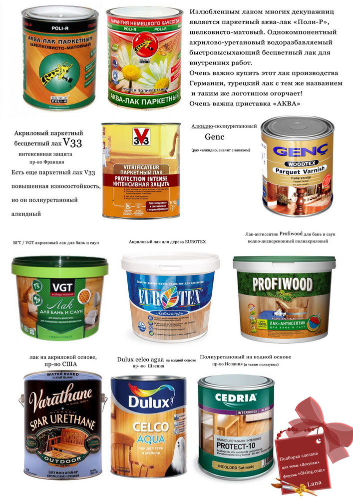 Все лаки, что показываю, это проверенные декупажницами и с хорошими отзывами. Основные требования - чтоб быстро высыхал, чтоб не лип, чтоб не желтил, а если и желтит, то в допустимых пределах, чтоб не полосил при нанесении кистью, чтоб не было пузырьков при нанесении и т.д и т.д. Лаки интересуют нас только бесцветные. Алкидные, т.е. те, что воняют, в исключительных особых случаях.