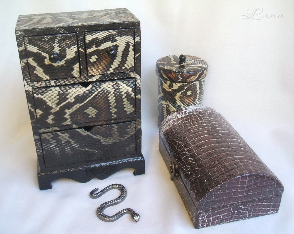 Тут МК не надо, достаточно посмотреть на фотографии и понять как делалось. Используем сеточки разные. Для каймановой (крокодиловой) кожи я использовала сеточку от картошки. Для кожи питона сеточку от мандарин. Шпаклевка по дереву, потом грунт, покраска и приклеила распечатку на шелковой бумаге. Влажной тряпочкой вдавливала эту тонкую бумагу, чтоб подчеркнуть рельеф "кожи". И лакировка.