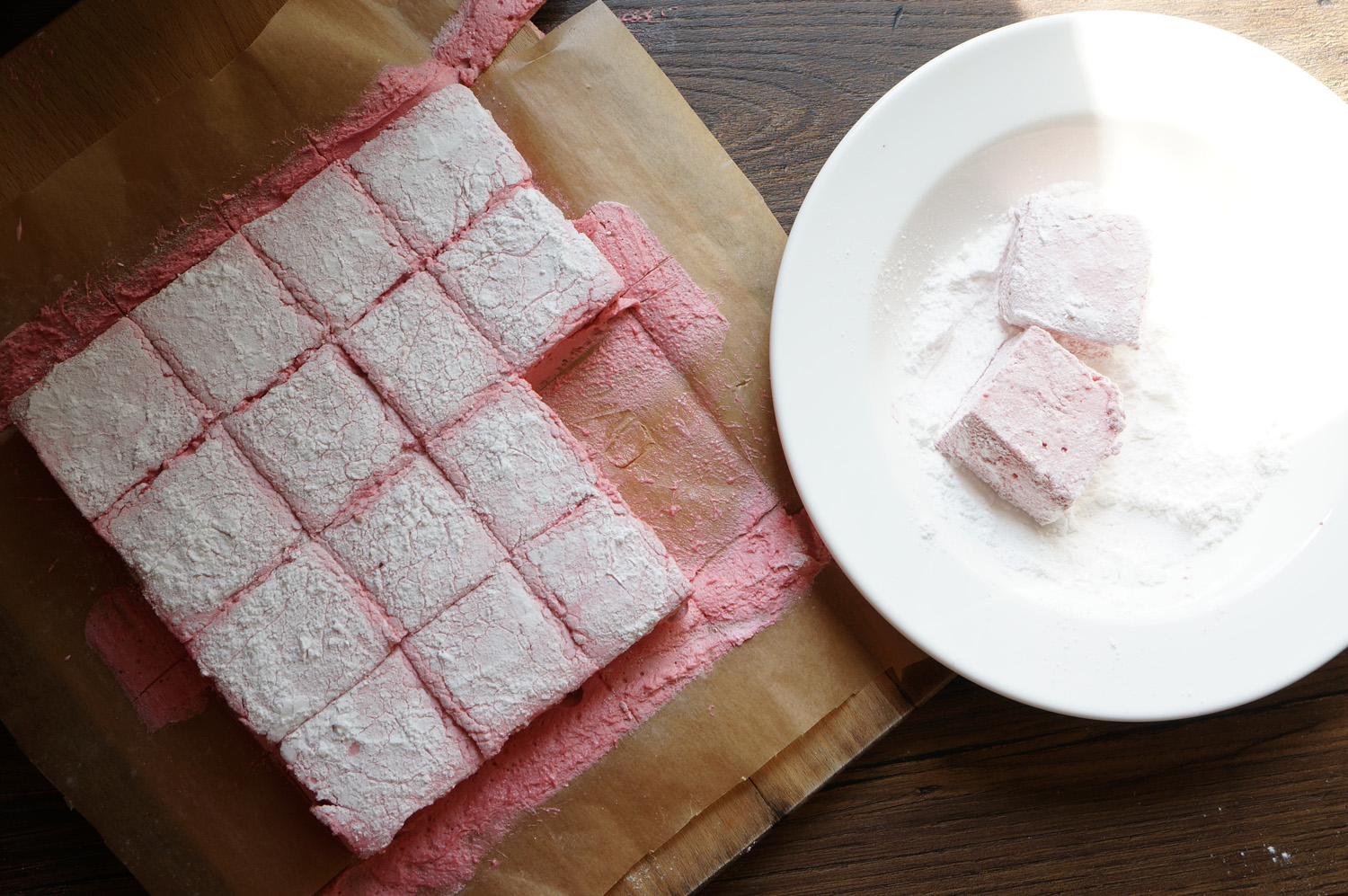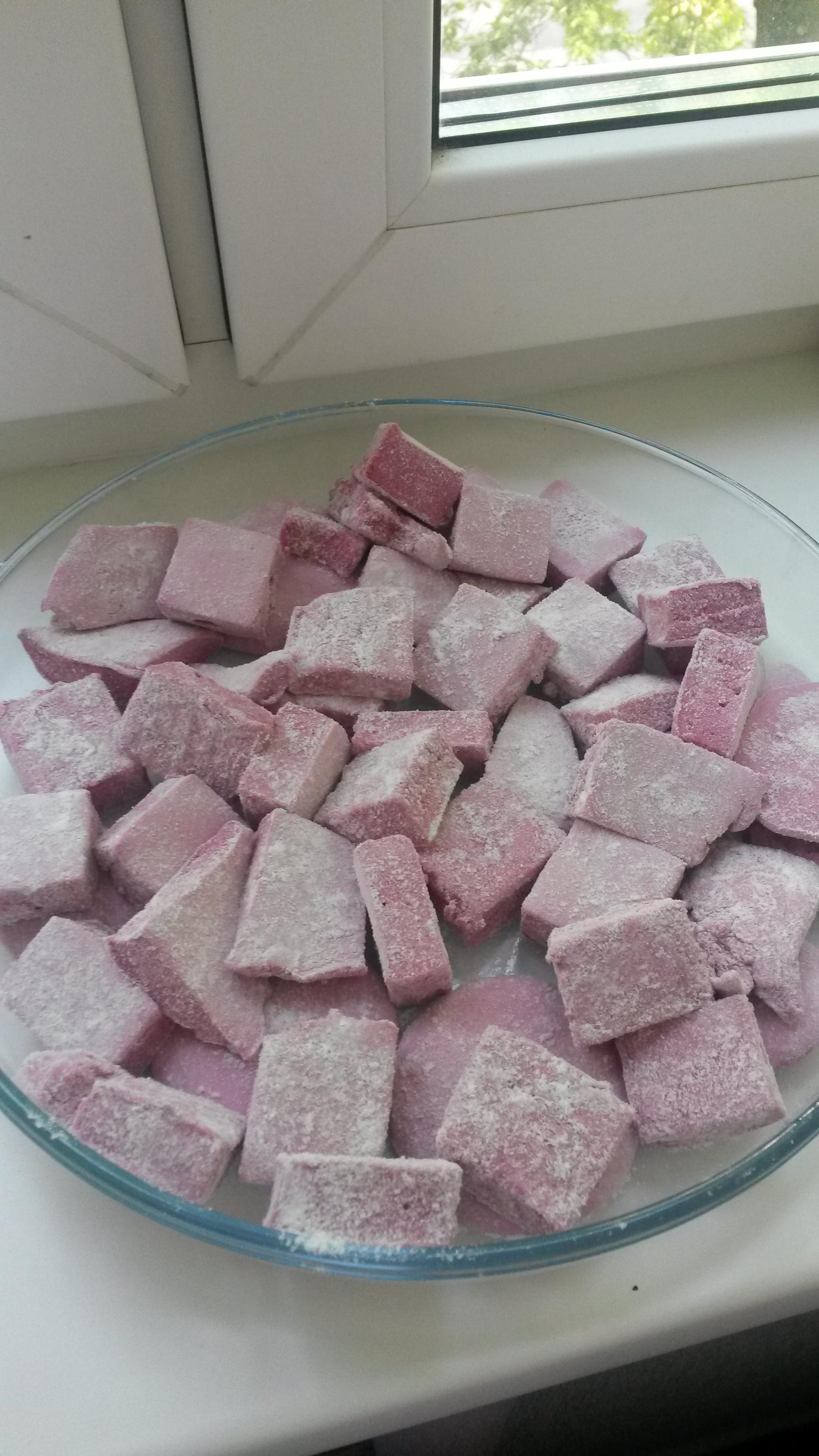 6. Через 3 часа, выньте застывшую массу из формы, аккуратно освободите боковые стенки от пленки/пергамента и нарежьте на нужные квадраты. Каждый сегмент обваливайте в сахарной пудре со всех сторон. Оттряхивайте излишки.