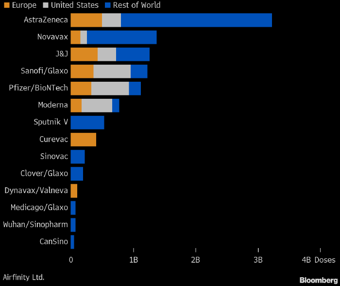 Приведенный выше график отражает планируемое количество доз вакцины (в млрд штук), которое различные производители планируют поставить в Европу (оранжевым), США (белым) и остальные страны мира (синим). Источник: Bloomberg