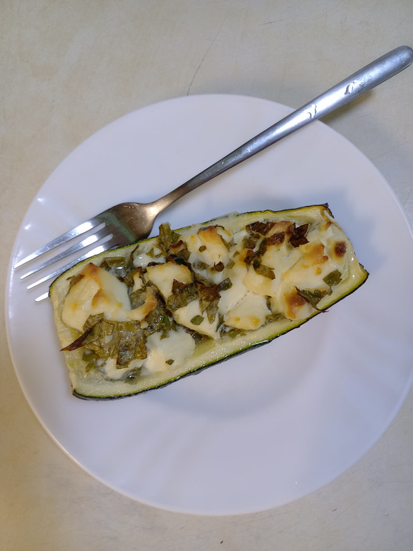 Цукини режу напополам, вырезаю семечки, а туда начинку из сыра, сметанки, зелени и чесночка) вместо чеснока ещё острый перец добавляю, тоже вкусно получается)