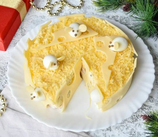 Оформляю бока салата сырными ломтиками, устанавливаю мышек.