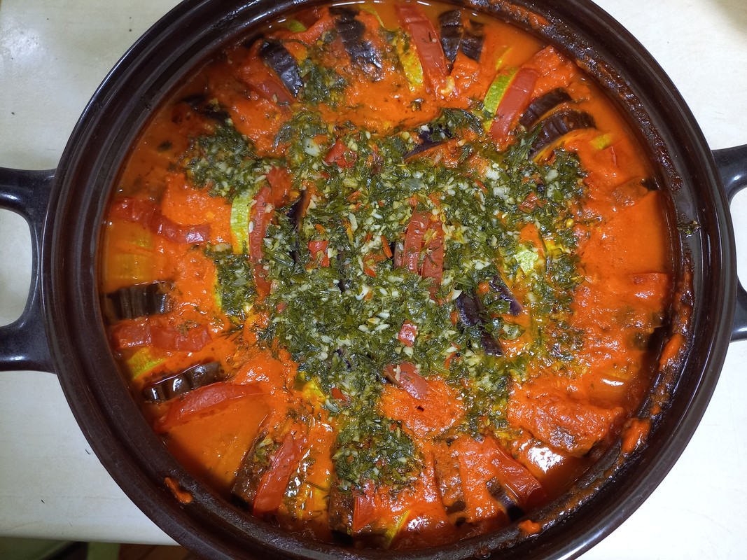 биреш кабачки... помидоры, курицу, чеснок, спаржевую фасоль, петрушку, болгарский перец, помидор и смесь перцев...все жаришь и сметану.