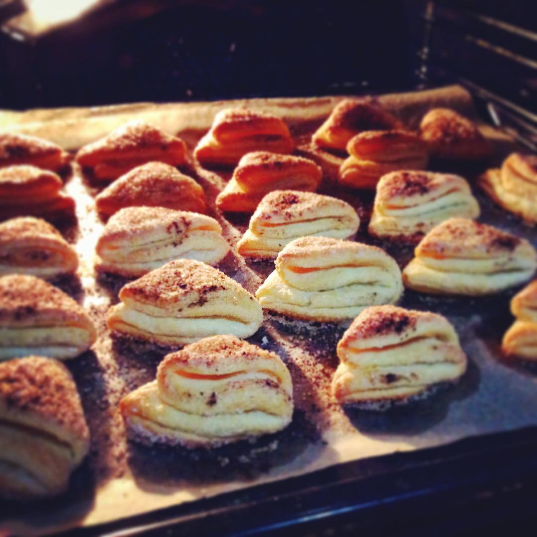 Каждый кружок обмакнуть одной стороной в сахар, сложить пополам обсахарённой стороной внутрь, получившейся полукруг опять обмакнуть в сахар и снова сложить засахарённой стороной внутрь, одну сторону получившегося треугольника обмакнуть в сахаре.