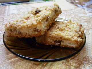 Смазать маслом лист и на него выложить половину крошки, затем начинку и потом оставшуюся крошку.