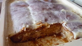 Сметану взбила с сахарной пудрой ( с сахаром крем становится жидким), добавила ванилин (первый раз делала без него, вкус был тоже отменный). Залила кремом горячий пирог. При чем отодвигала немного кусочки, чтобы сметана попала между ними.