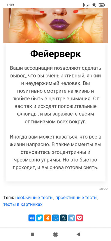 Ваши ассоциации позволяют сделать вывод, что вы очень активный, яркий и неудержимый человек. Вы позитивно смотрите на жизнь и любите быть в центре внимания. От вас так и исходят положительные флюиды, и вы заражаете своим оптимизмом всех вокруг.