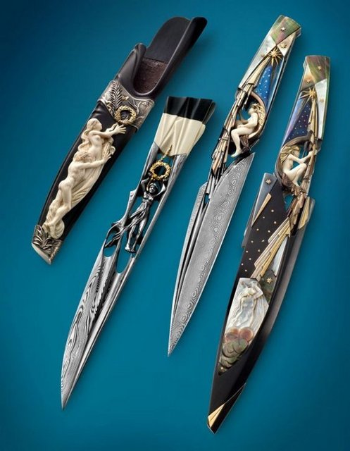 Первый нож просто фантастика. К нему в комплект походу часы дают, где механизм прозрачный! А вот этот что на черном фоне. Очень похож на нож из фильма Тень...хотя там был кинжал, не суть..напомнило)) Сиш, любишь по ночам ножи рассматричать?) Искуство, понимаю) Как сама, в целом?!)
